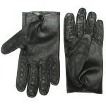 The Vampire Gloves are sporty black leather gloves made of soft, thin leather, with a snap closure at the wrist and one other special feature: the fingers have prickly little tacks sticking out of them (96 to be exact). The tacks are short, about 1/8″ long, and will prick and scratch the skin like little thorns, but will not pierce the skin unless you squeeze or slap it very firmly.
