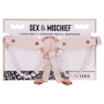 Get your lover to open wide and say «AHHH» with this naughty O-Ring Gag with Nipple Clamps. The gag consists of a small metal O-ring wrapped in leather, connected to two sturdy leather straps. Two chained nipple clamps keep your nipples perky, and the coated clamps easily adjust to fit…
