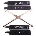 Ankle and wrist cuffs are attached to this restrictive X shaped rod-hog tie restraint via detachable clutch rings allowing the user to use the cuffs separately as well if they choose.